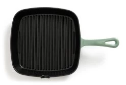 Cook up some classics. Our sage green cast iron griddle pan’s perfect for producing juicy burgers, tasty charred veg and sizzling sausages. With even heat distribution and a spout to pour off fat from the ridged collection channels, this is a healthier way to prepare a meal.