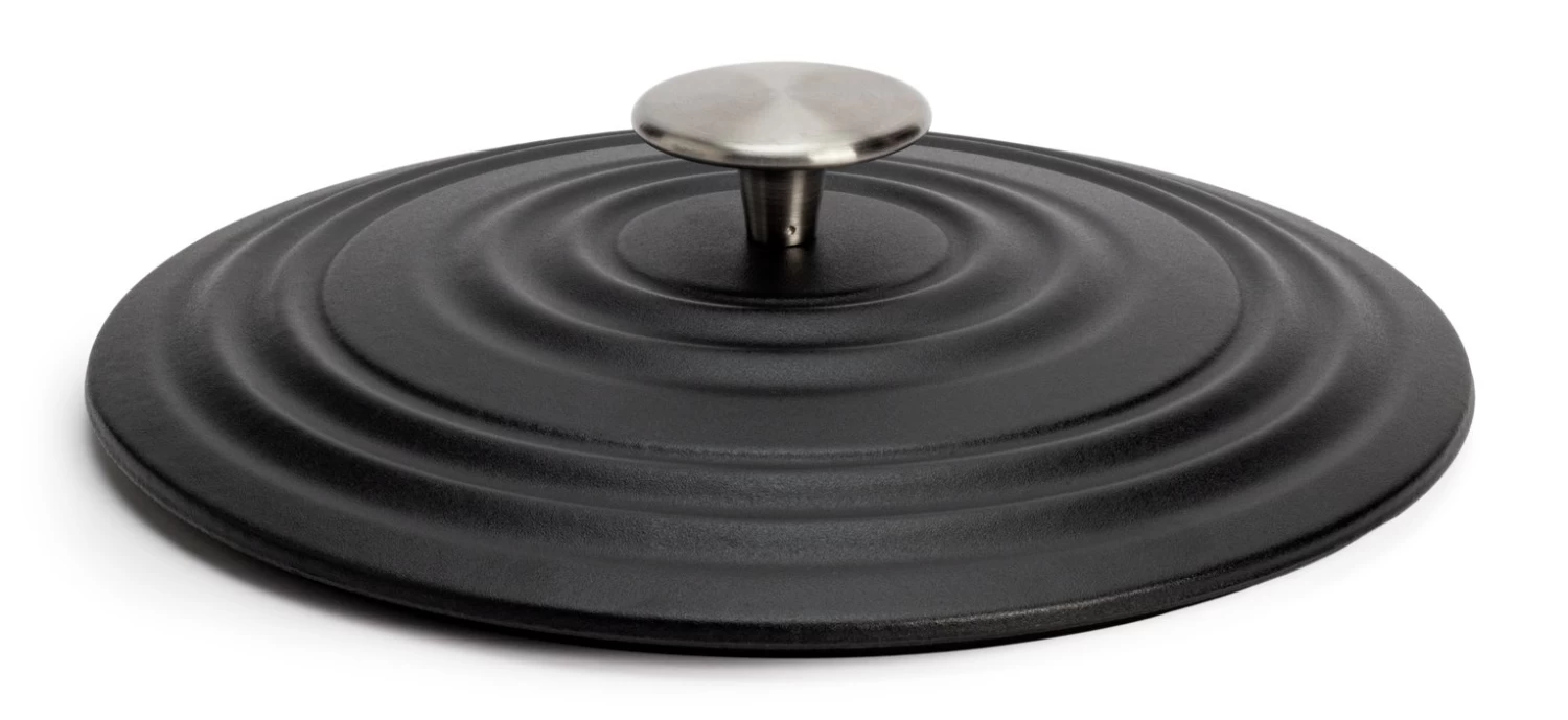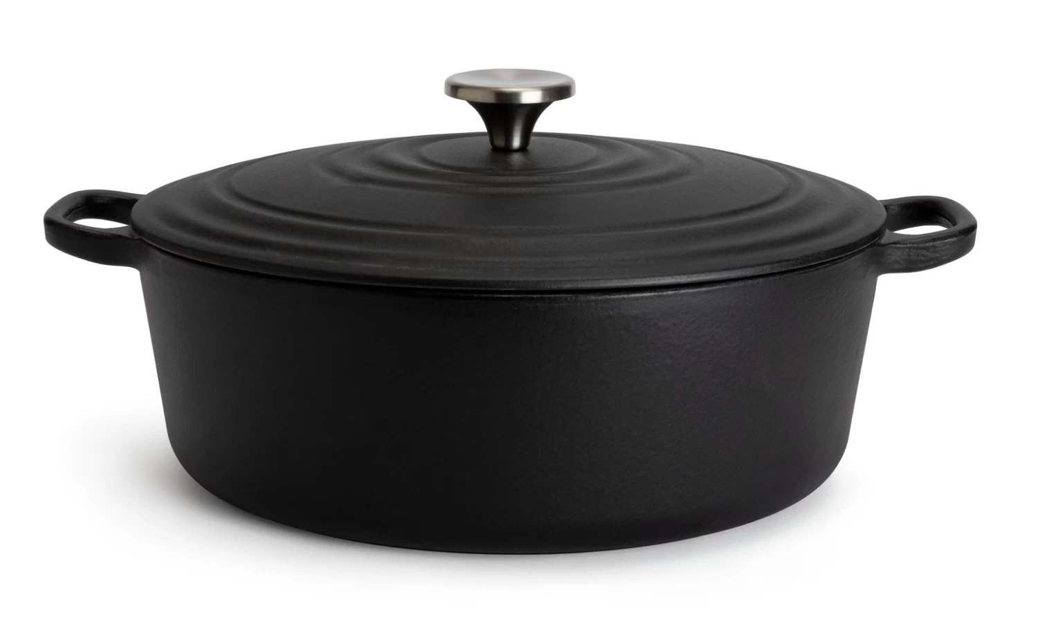 Cook and serve in style. Feast your eyes on our bold black cast iron casserole dish. With its ripple effect and silver knob, it’s handsome enough to take straight from the oven to the table. And being cast iron it cooks evenly and retains heat for longer. So goodbye burnt bits and hello hot meals. It has an enamel coating which makes it easier to clean, too. What a dish.