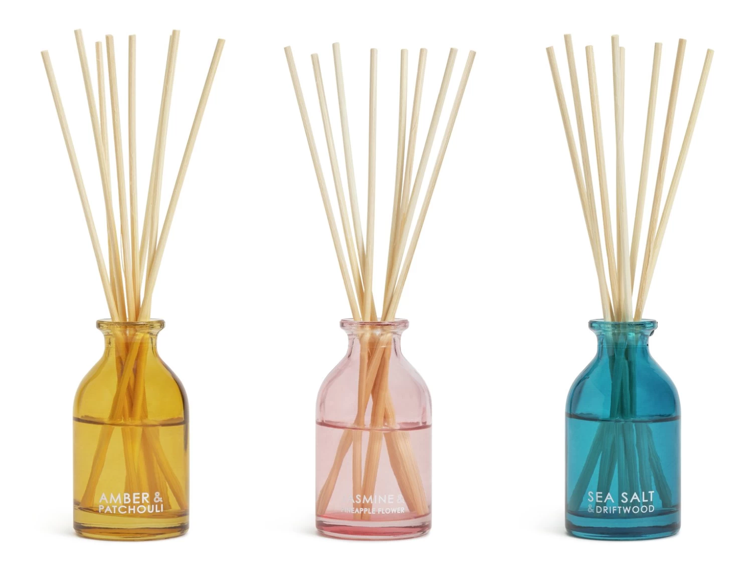 Bring home the scents of nature with this fragrant diffuser set. The 3 scents feature sea salt blended with musky driftwood. Earthy notes of patchouli blended with rich amber and sweet sensual jasmine with a hint of fresh pineapple. Each comes in a coloured glass bottle with rattan reeds. Presented in a charming box it makes the perfect gift.