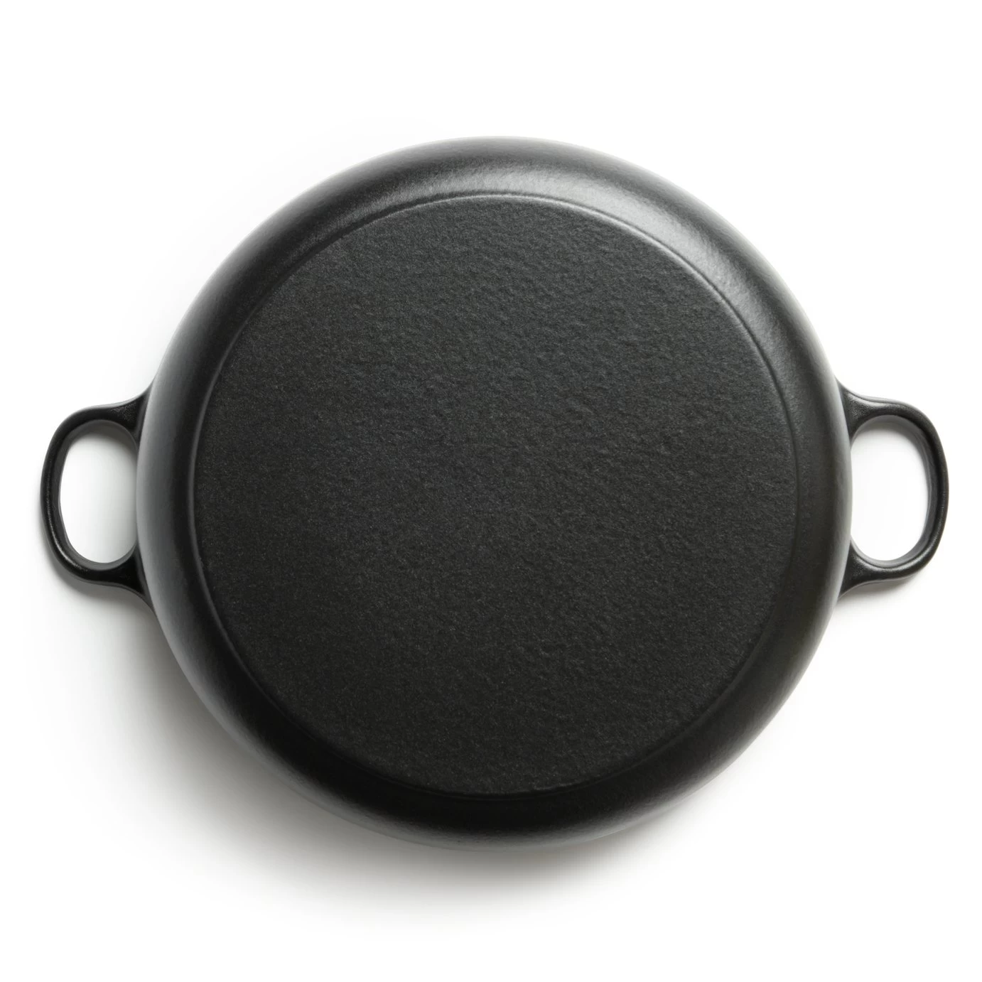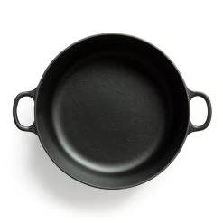 Cook and serve in style. Feast your eyes on our bold black cast iron casserole dish. With its ripple effect and silver knob, it’s handsome enough to take straight from the oven to the table. And being cast iron it cooks evenly and retains heat for longer. So goodbye burnt bits and hello hot meals. It has an enamel coating which makes it easier to clean, too. What a dish.