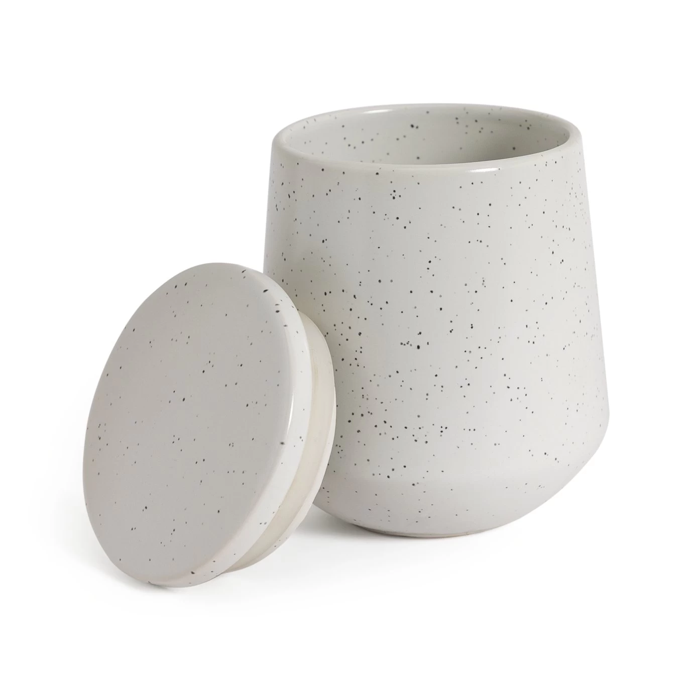 Simply essential. Store tea and coffee in this set of minimalist stoneware cannisters. Gently curved design lines and speckled detail on eggshell white creates a modern aesthetic. And the airtight seal on the lids keeps things fresh. An on-trend duo.