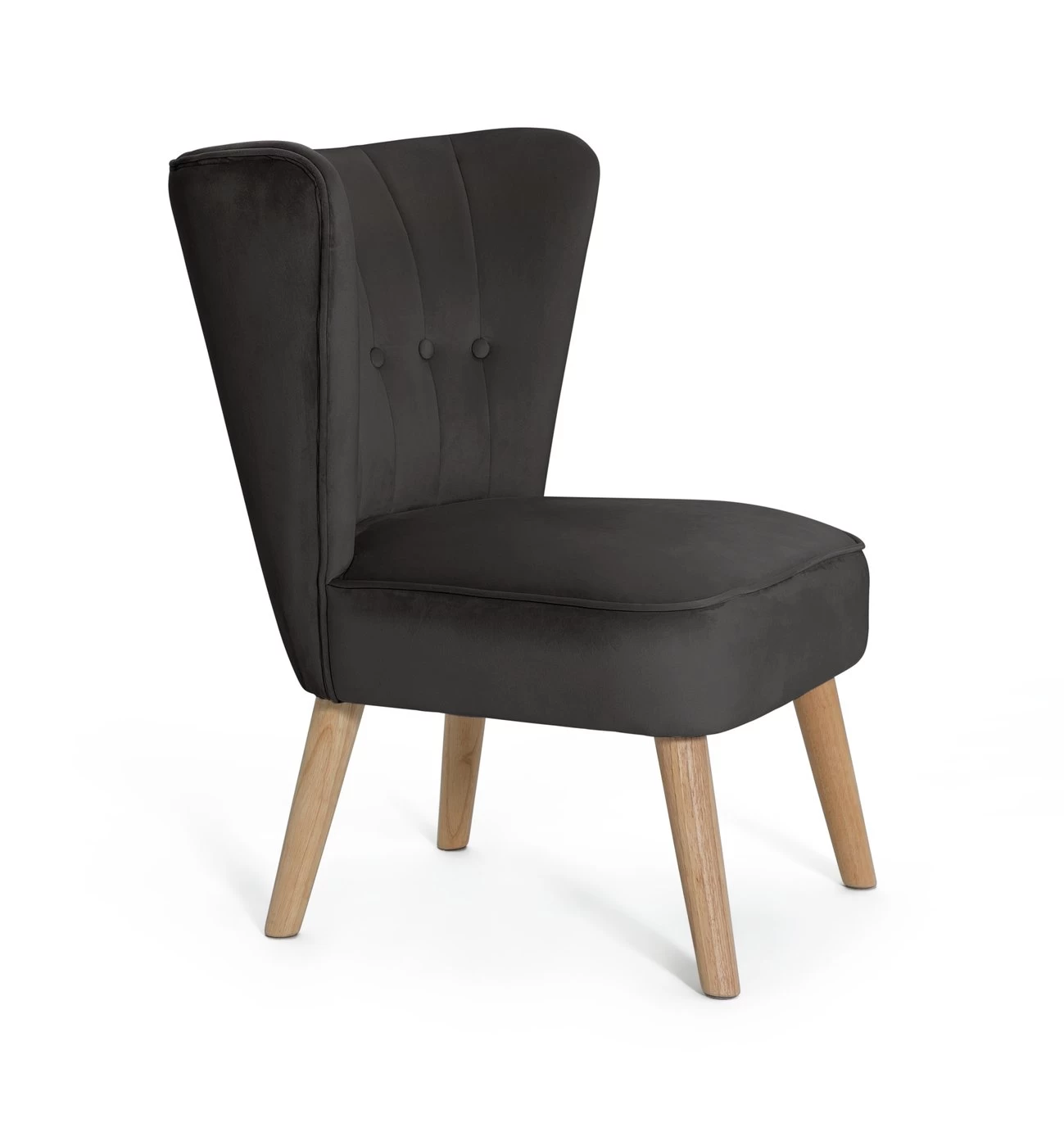 Sitting pretty. Elegant in charcoal Alexis, is all about glamour. An accent chair with an emphasis on refined style. With a nod to art deco, the gently curved back is upholstered with piped and button detailing. Comfy too. The plush, plump seat provides a perfect place to perch. And we’ve added tapered wooden legs to finish off the look. Cocktail anyone?