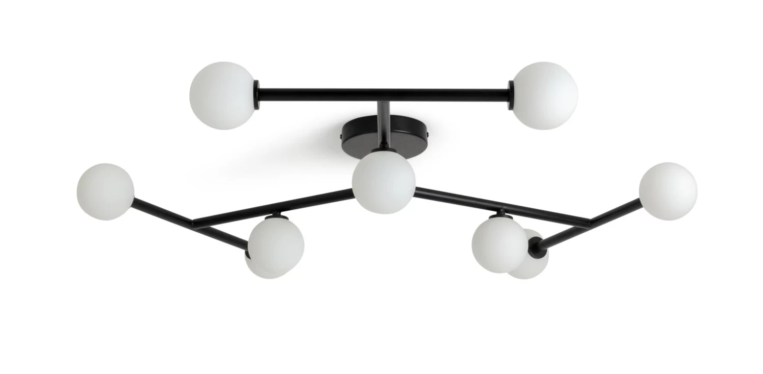 Meet Alonso, the modern chandelier. A stunning combination of 9 organic glass globes and black sprayed steel, this ceiling light will add instant mid-century chic to your look. It’s ideal for lower room hights, with its flush to ceiling gallery and shorter drop. Want to dial it down? Add a dimmer switch and this fabulous array of glowing glass will gives off several levels of calm, diffuse light. Lovely. Match with natural wood furniture and graphic patterns and really embrace your inner Scandi.