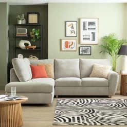 Stretch out and sink into our modern comfy chaise. With deep pocket sprung seats and an abundance of plump cushions this sofa was made for lounging. Upholstered in grey fabric with warm toned wooden feet.