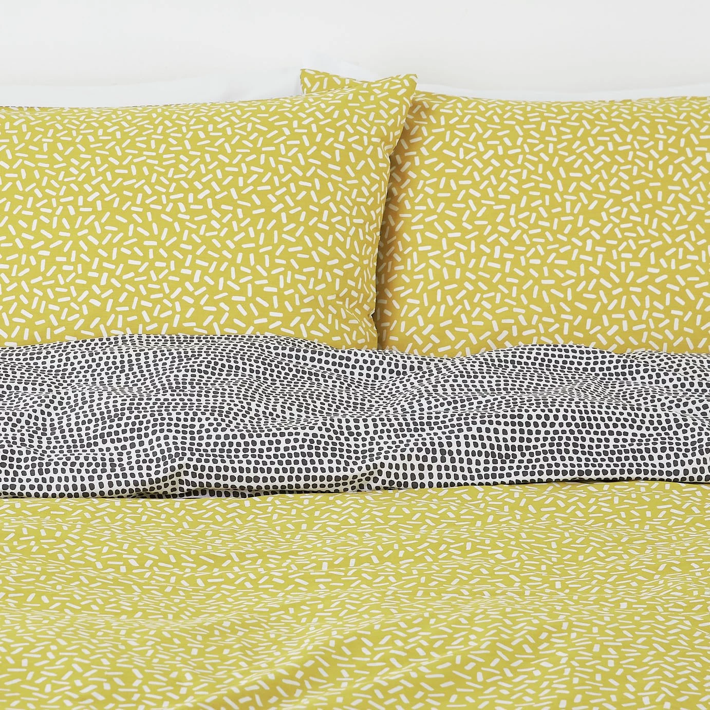 Smart dreams. Our Betsy bedlinens feature a graphic white print on yellow on one side and black and white on the reverse. 100% cotton and a 180-thread count makes them cosy to sink down into at the end of the day. Fits in with any decor style you have in your home, from Scandi, to country cottage to monochrome. This great value single set comes with 2 pillowcases and a duvet cover.