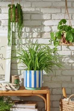 With hand painted blue and white stripes and mint green base, our ceramic planter has a fresh seaside feel about it. Pot up with lush greenery or colourful florals for an instant burst of brightness.