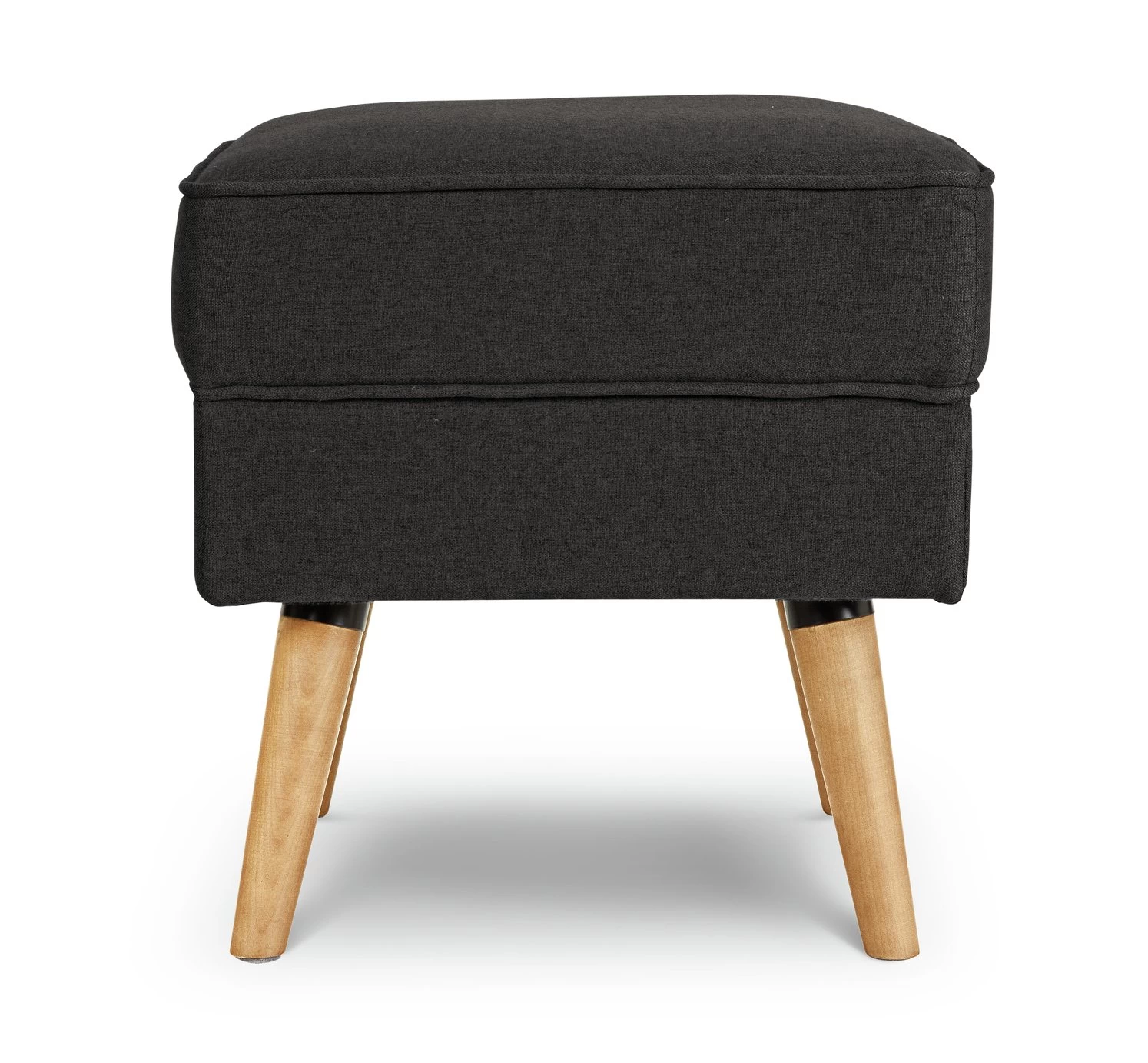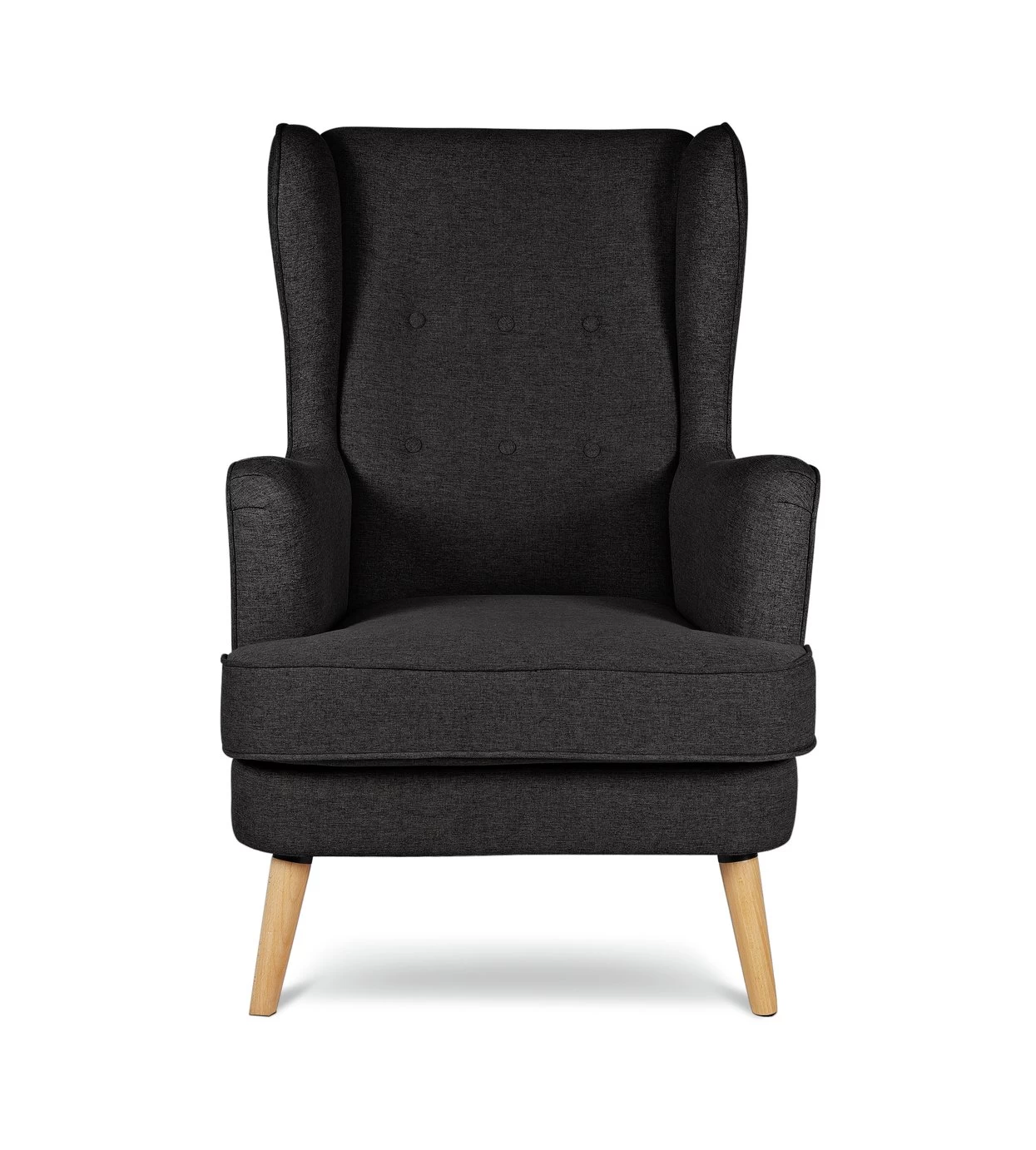 High back, high style. Plough through the chapters sitting comfortably on Callie, the wingback armchair. Rest your feet on the matching footstool and chill. So relaxing. Upholstered in chic, charcoal fabric. The classic button detail and ruched fabric on the arms of the chair add textural appeal. Splayed Scandi-look wooden legs on both pieces add a touch of the contemporary. A vintage duo with a modern twist.