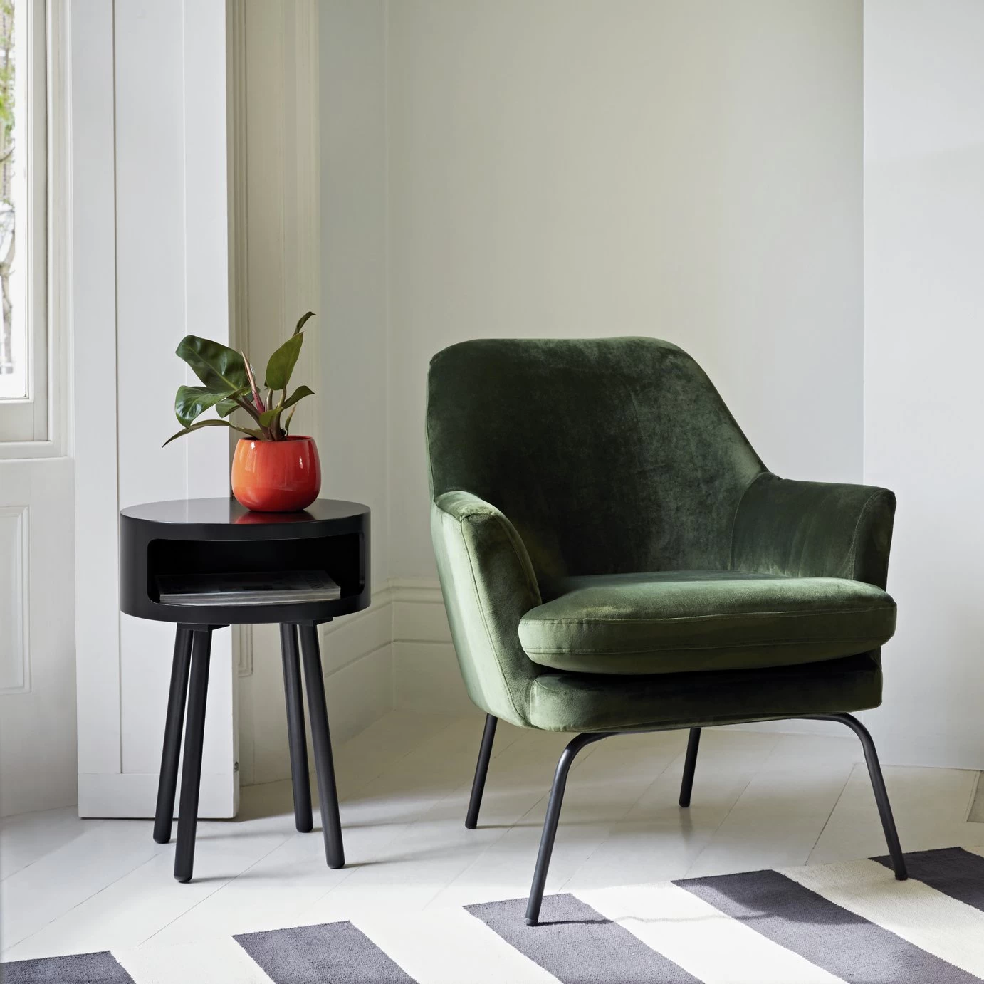 With its gentle round edges, high reclined back and sumptuous padding, the foam-filled seat cushion invites you to relax and wind down in style. This elegant and luxurious design is finished with black metal legs for a contemporary, lighter-than-air look, which makes it ideal for smaller spaces. Exclusive to Habitat and available in a choice of colours, the Celine chair is upholstered in durable polyester velvet and its seat cushion has piping to maintain its clean edge.