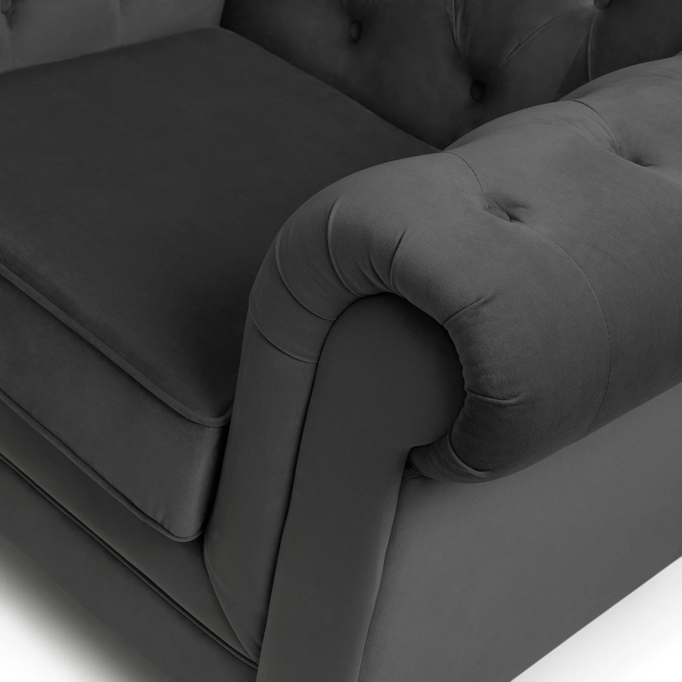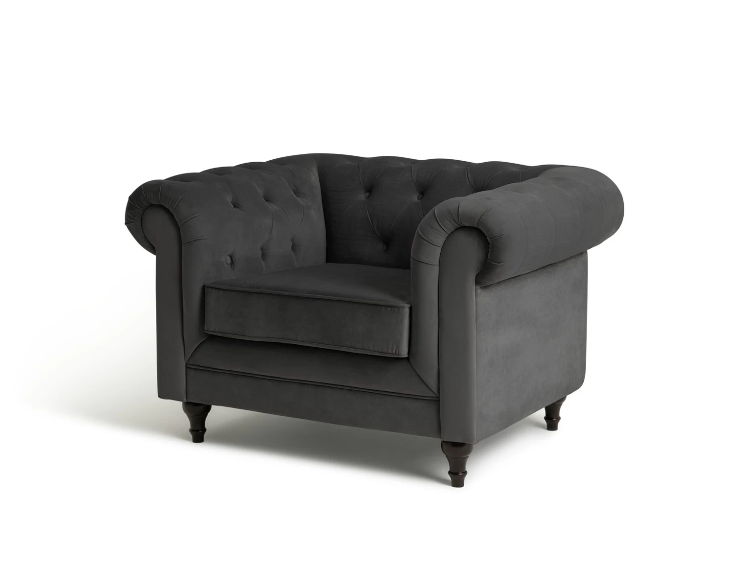 Our classic Chesterfield armchair is so incredibly inviting you’ll want to stop and sit. Upholstered in rich velvet, this smart, charcoal charmer is everything an accent chair should be. Eye-catching, welcoming and full of character. Pleated padded arms and traditional button-back bring wrap-around luxury, while the deep seat cushion offers instant lounge appeal.