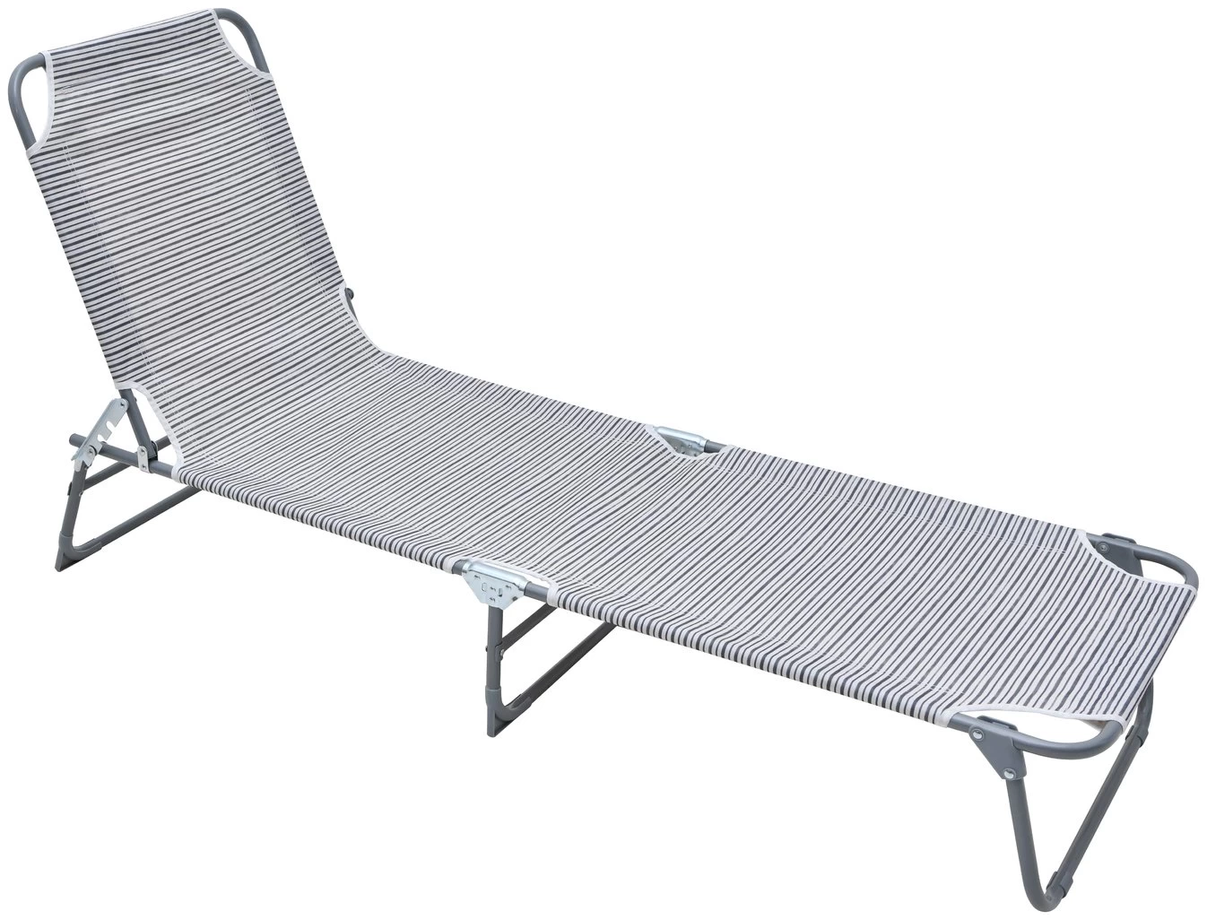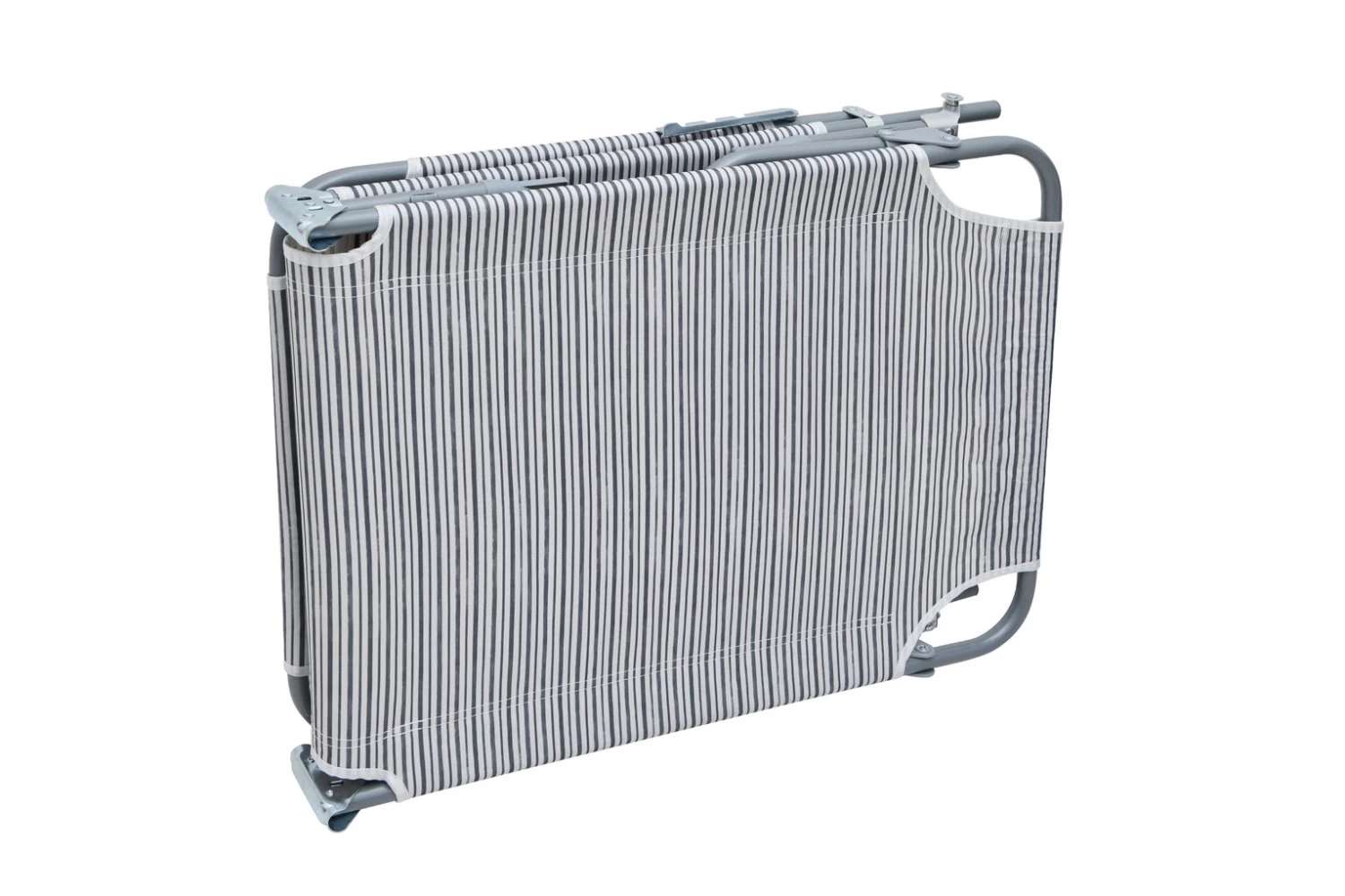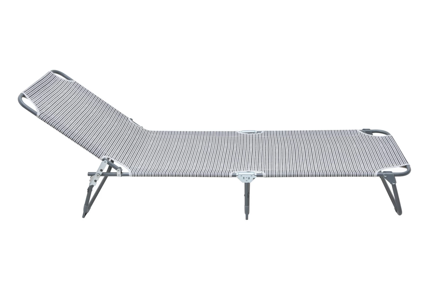 Hello Summer. Soak up the sun’s rays on our sun lounger, perfect for lazy days. With a choice of 3 recliner settings, just lie back and relax. Ideal for garden, beach or camping trips. The lightweight grey powder-coated frame folds in seconds and the fabric is wipe clean. So need to worry about any little spills. Be daring with our popular grey striped fabric. Add flip flops. Summer sorted.