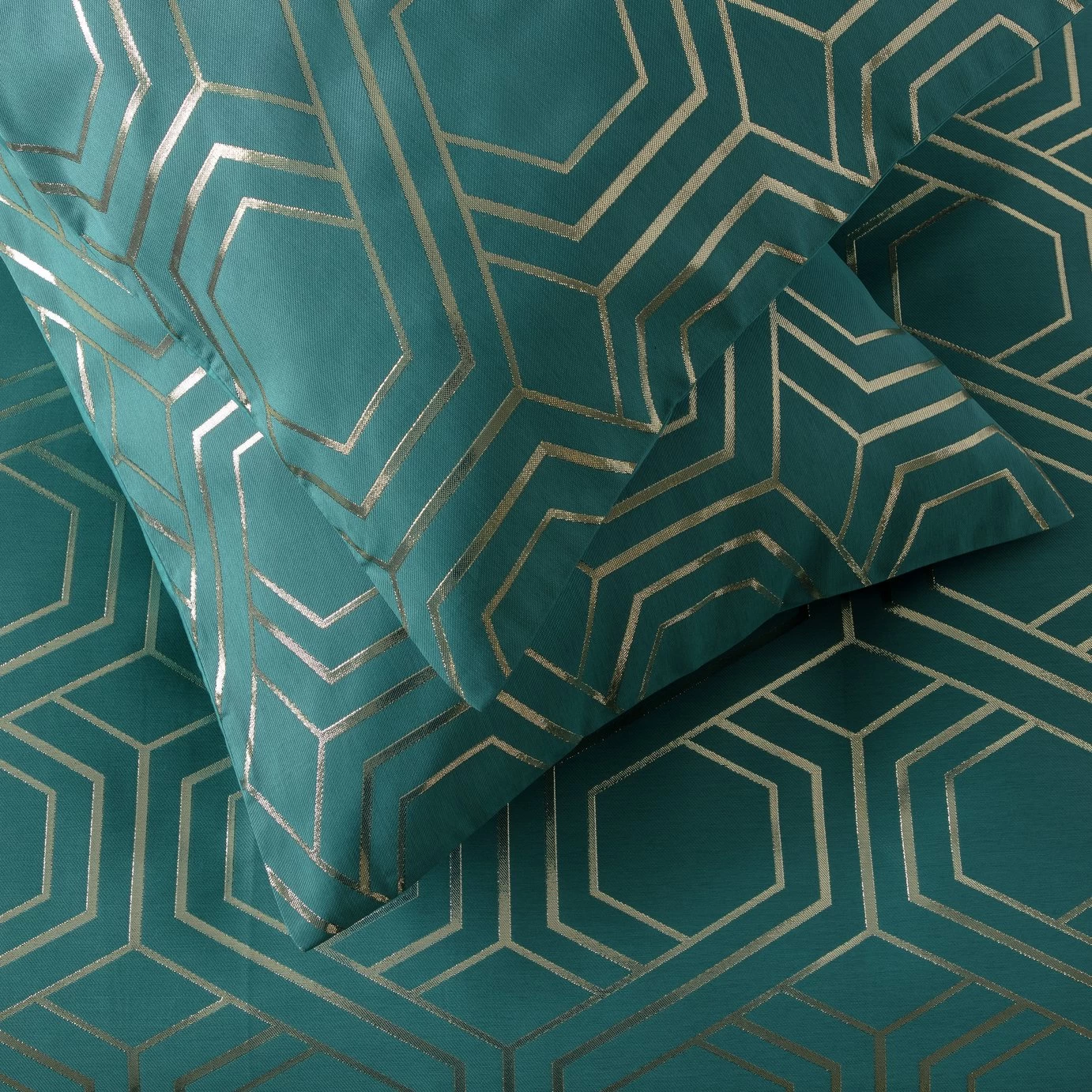Tranquil yet luxe. Settle in for a glamorous night’s rest with our double jacquard bedding set. Geo shapes woven in gold lurex thread pop against deep teal for a look that’s fashionably contemporary. Wow. With a 180 thread count it’s a treat to sleep in. Sweet, dazzling dreams.