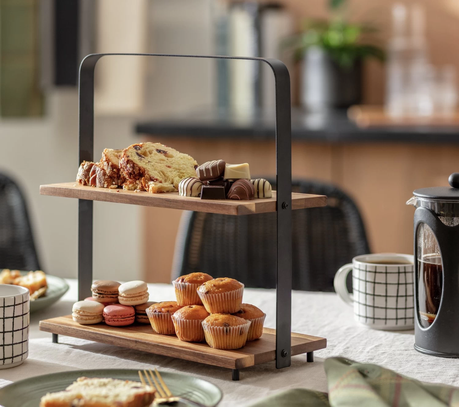 This industrial two tier serving platter is a great way to showcase your culinary creations. Two 100% Acacia wood boards are set in a stylish black metal frame. Create a dramatic, two level cheese board. Alternatively load your platter up with afternoon tea and carry it through to the lounge, it’s portable. Finger sandwiches on top, cupcakes on the bottom. Delicious. Folds flat for easy storage.