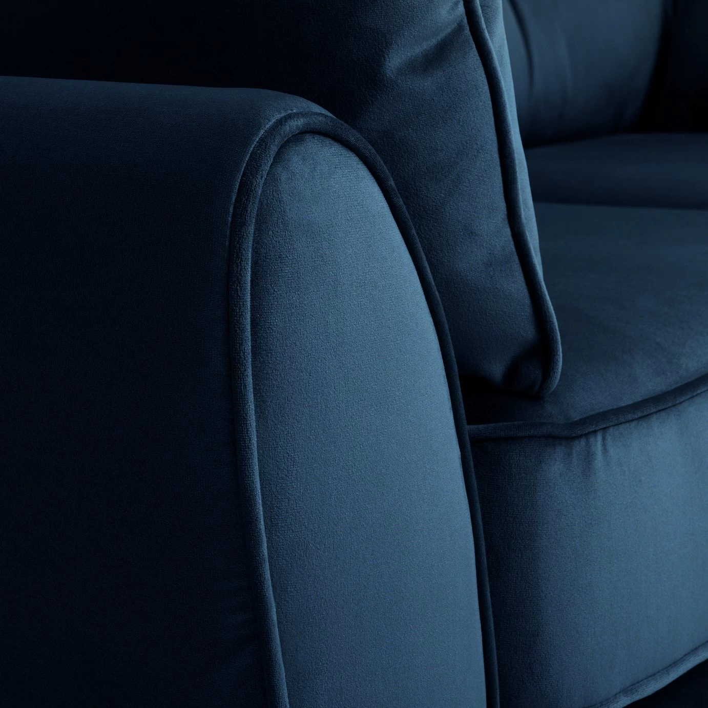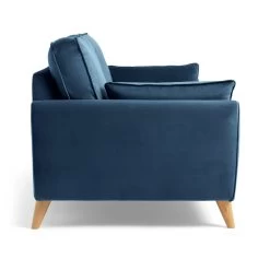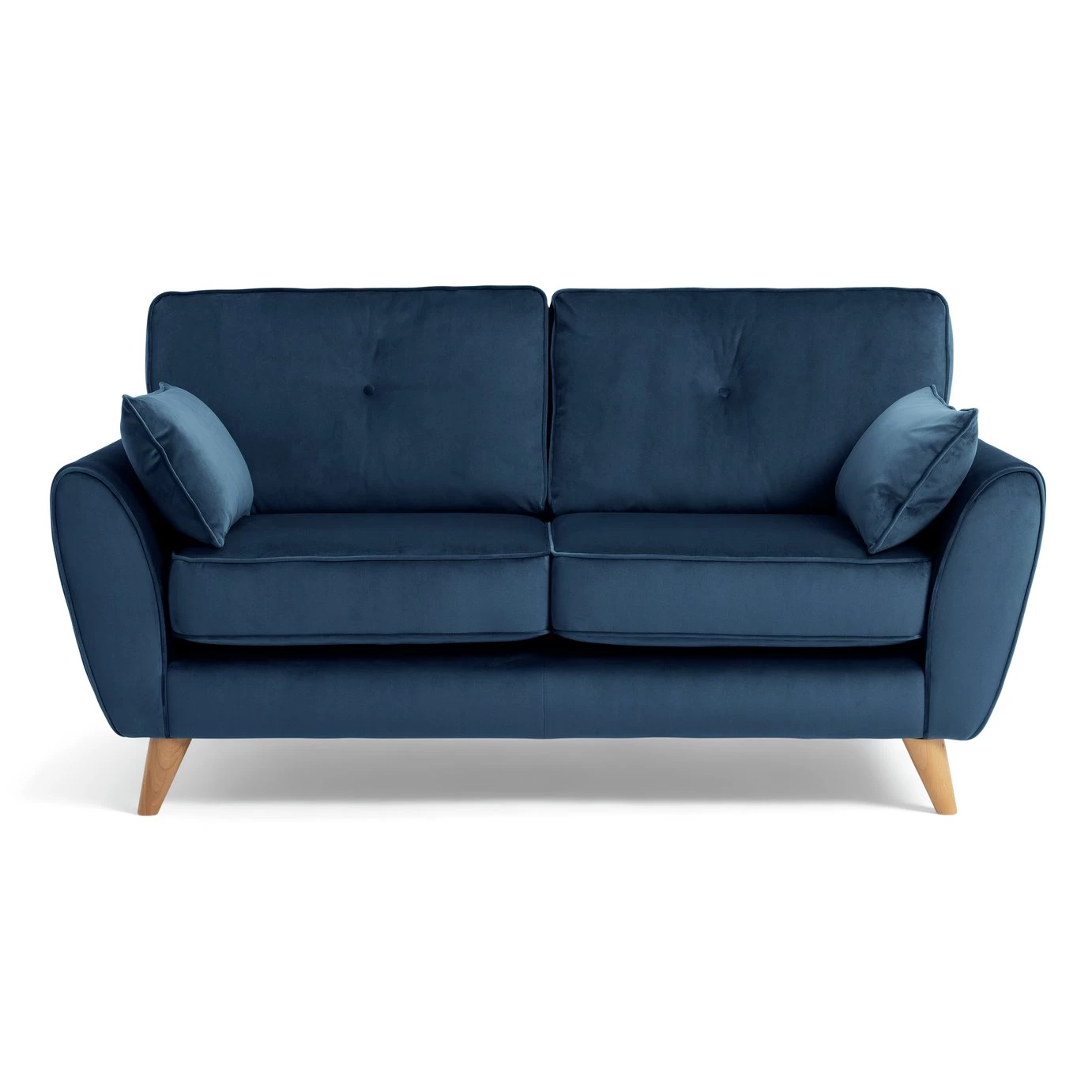 Retro chic. Upholstered in navy velvet, our 2-seater Iris sofa features mid-century modern touches. Check out the clean curves, button back removable cushions and splayed beech wood legs. Relax into the comfy removable seats, arrange the 2 scatter cushions and settle in.