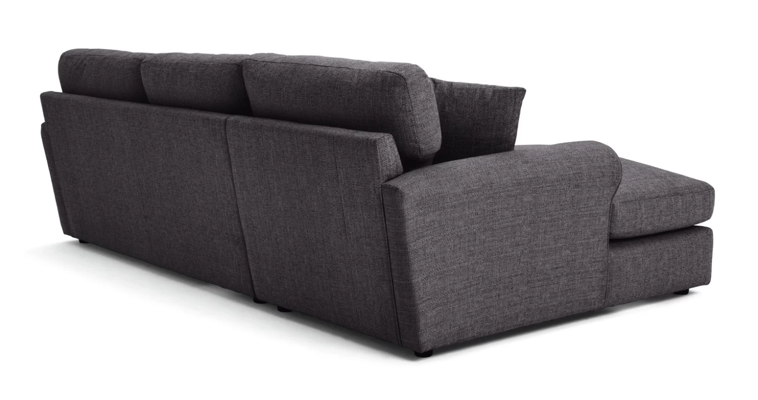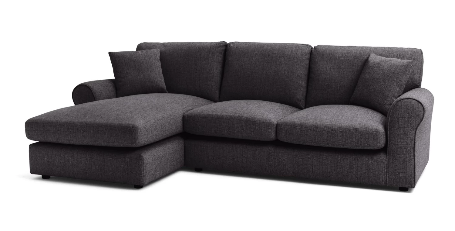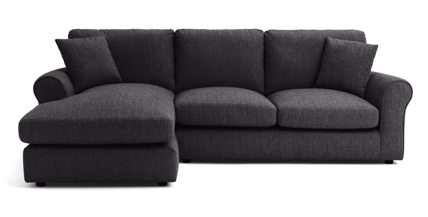 Sink in. Our classic Lisbon collection features deep seat cushions, generous scroll arms and cushioned backs. Upholstered in a textured charcoal fabric for effortless style. This corner chaise sofa is all about relaxation and comfort.