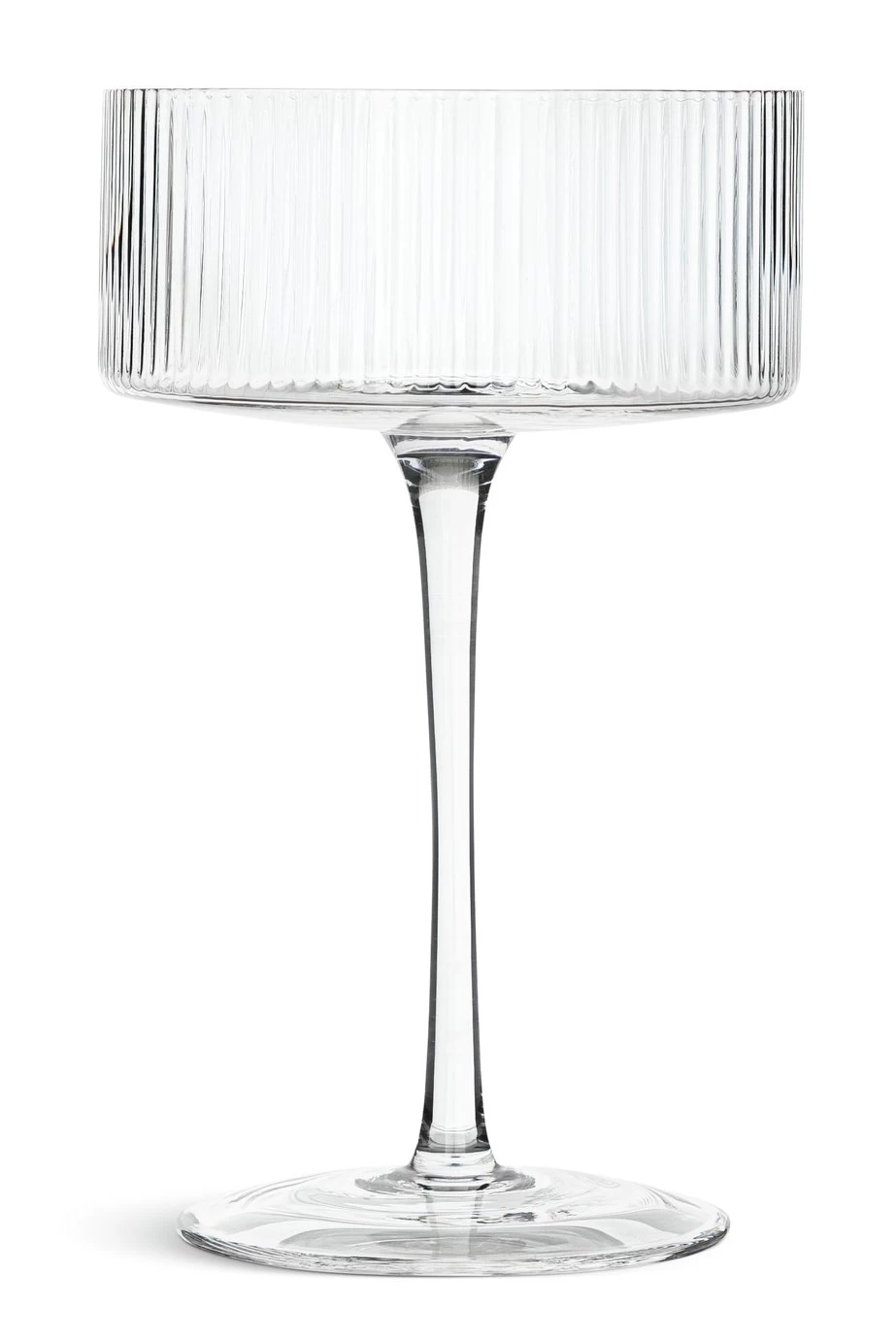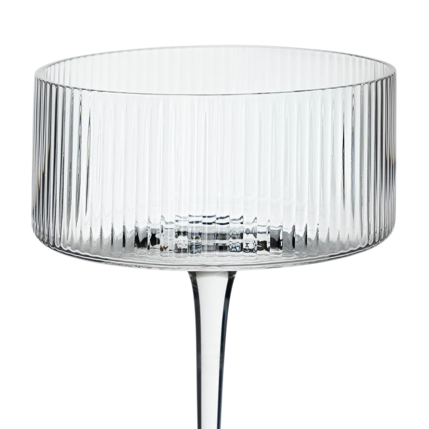 Celebrate vintage style, with this set of 4 elegant clear champagne coupe glasses. With a slender stem, wide bowl and striking ribbed effect, they’ll be a star turn at your next party. From fizz to a classic cocktail, keep these versatile hand blown glasses topped up, Chin chin!