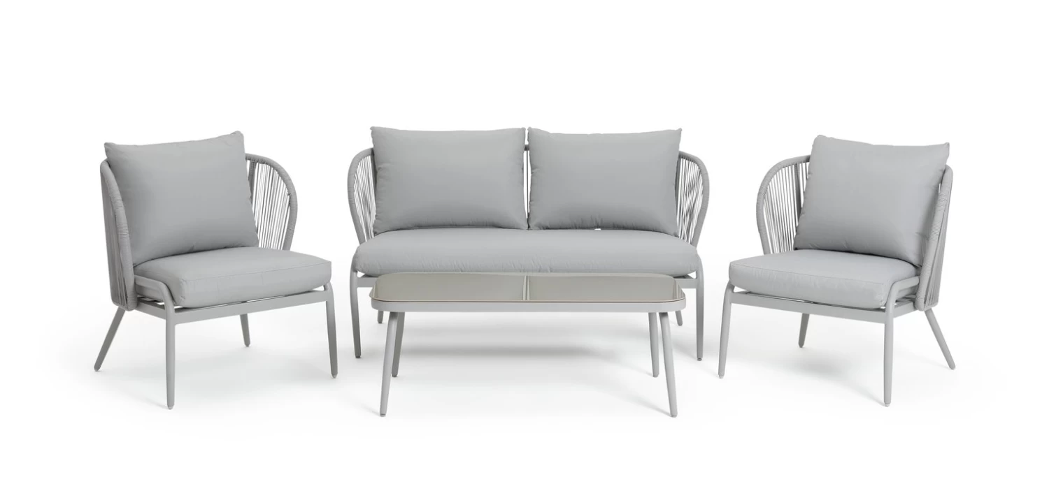Enjoy sophisticated outdoor living with our elegant 4-piece rattan sofa set. Muted shades, soft curves and deeply filled outdoor cushions make for an inviting retreat. We can’t wait to sink in. Borrowing from the boho trend, the stringed back design contrasts with the slim, steel tapered legs for a relaxed, modern feel. Includes a sofa, 2 chairs and a glass topped table, just the spot for a refreshing cocktail or two. And so easy to wipe clean. This is luxe lounging at its best.