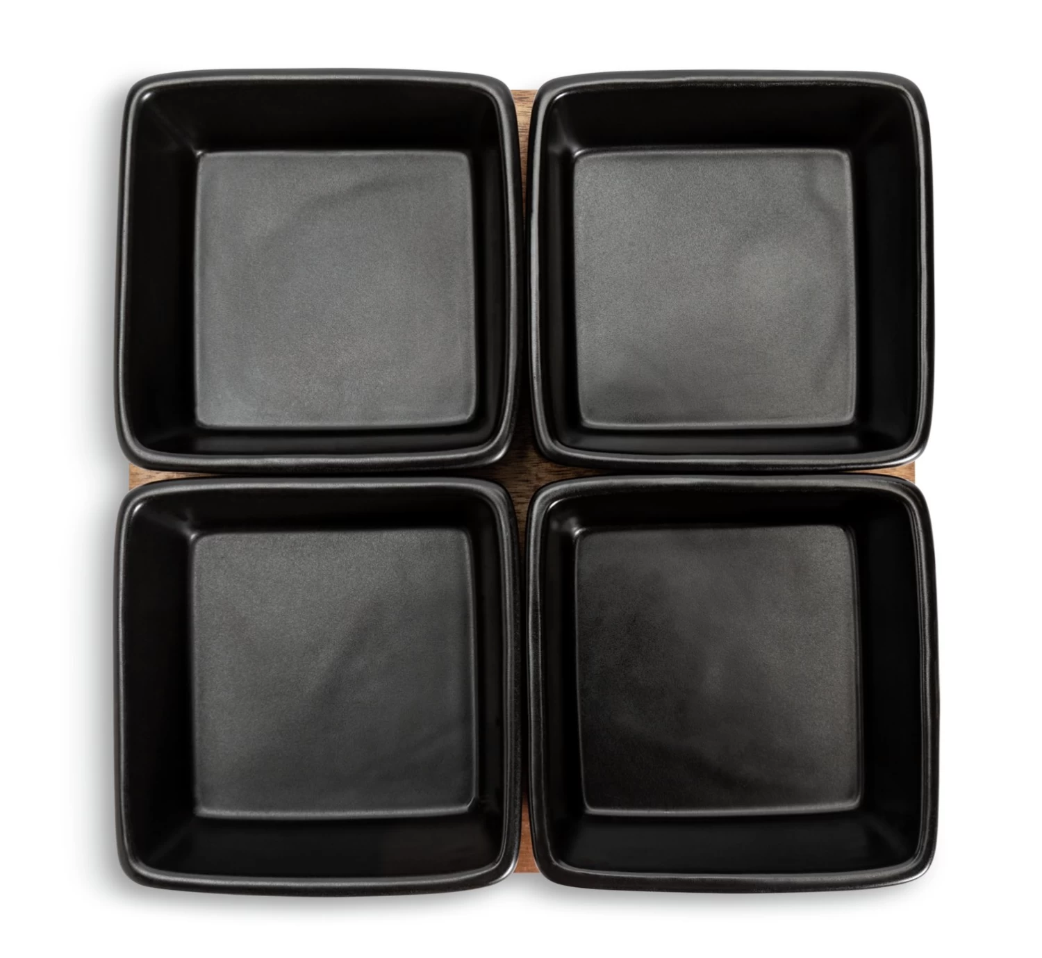 Matte black snack bowls? Don’t mind if I do. Resting on an acacia wood tray, these 4 square bowls are a cool way to serve small bites. Made from stoneware with a matte glaze finish.